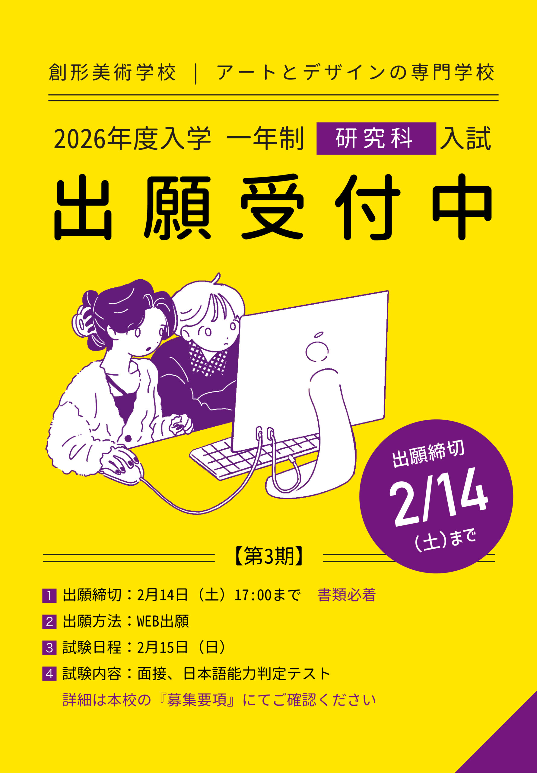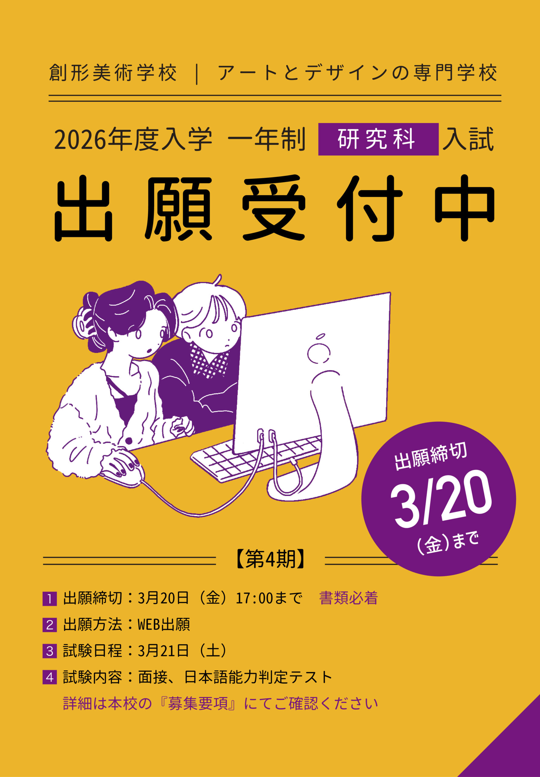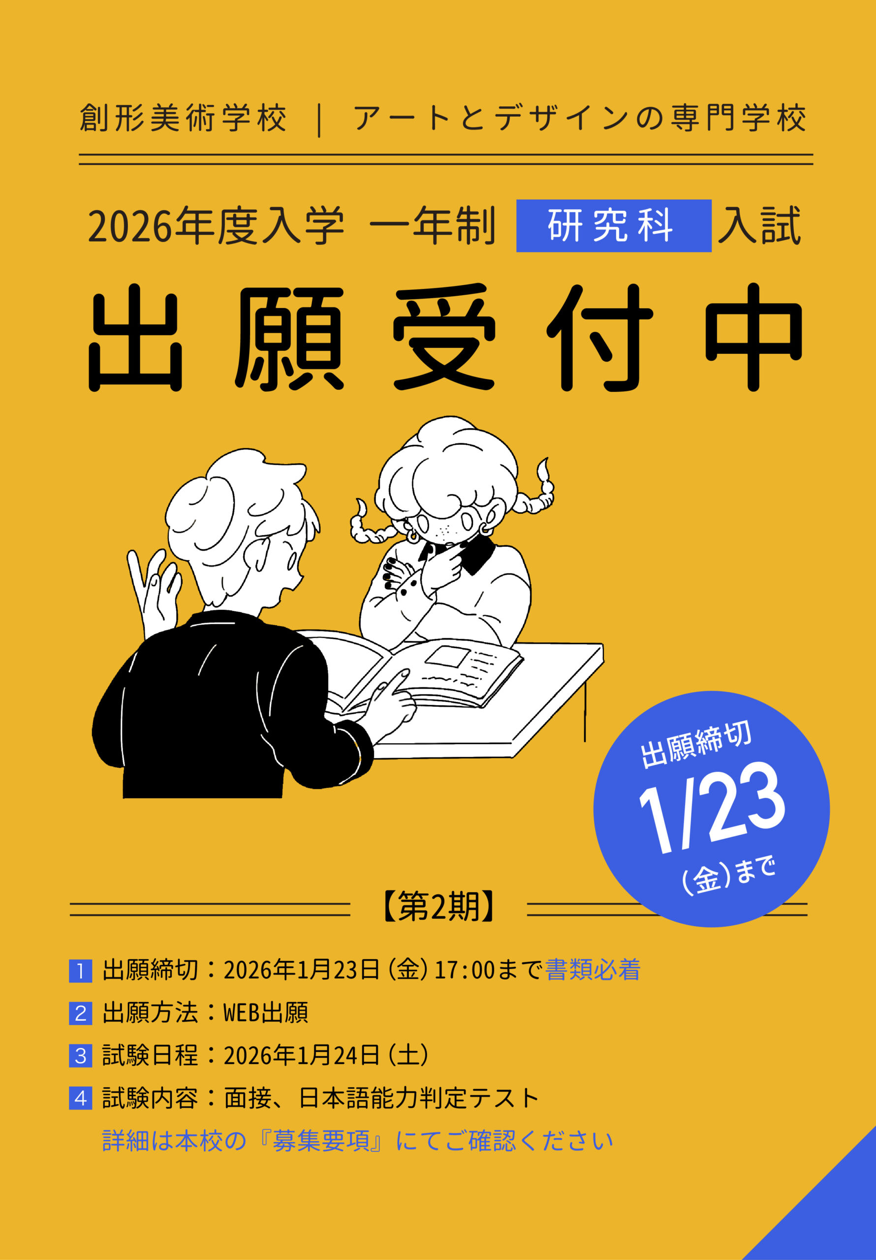 創形美術学校の研究科は、本校あるいは大学や専門学校などを卒業された人や社会人を対象として、より専門的なアートやデザインの研究活動を行うための場として設けられた1年制の研究課程です。